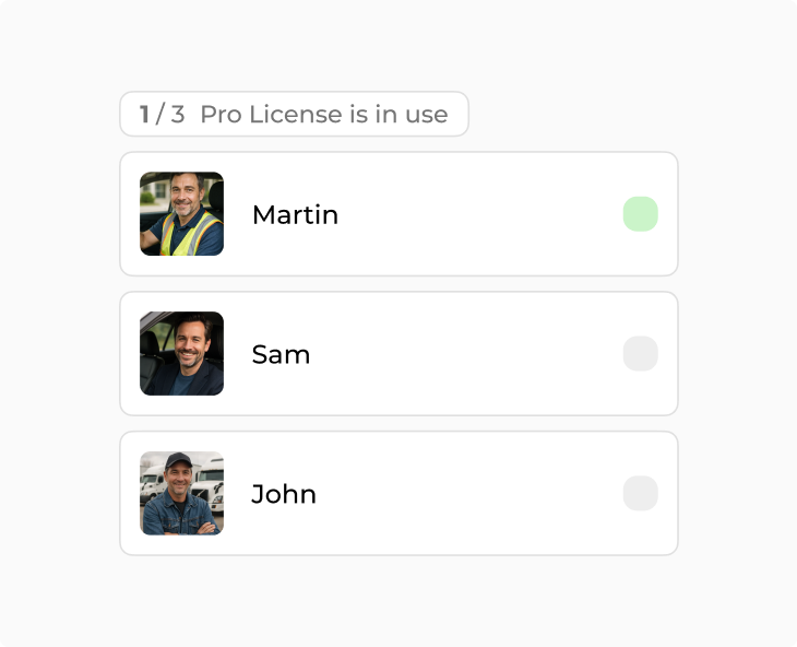 Scale your plan up or down whenever you need. Free accounts cover managers, paid seats cover drivers, and licenses can be reassigned — keeping your team under one plan.