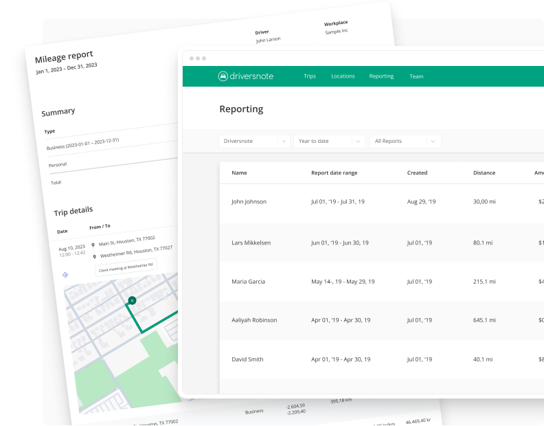 Export reports in PDF or Excel — from a single driver’s trips to all mileage data across your team.